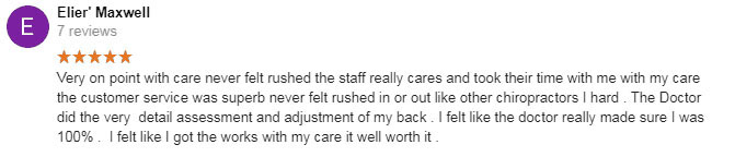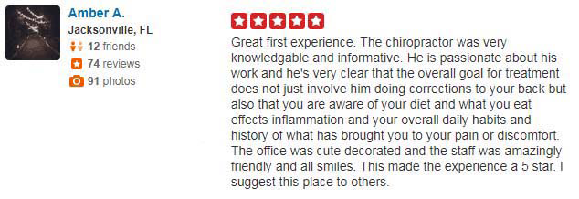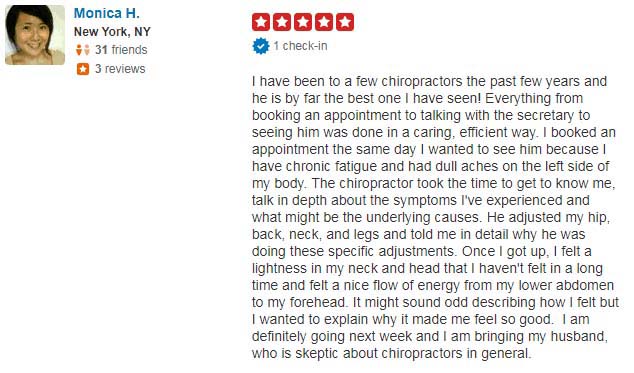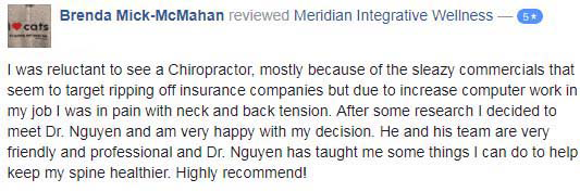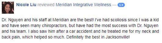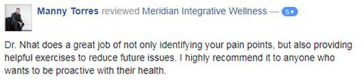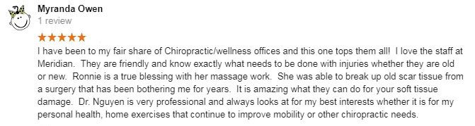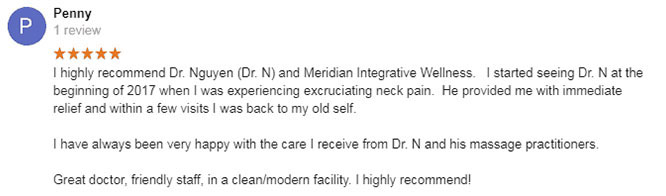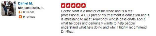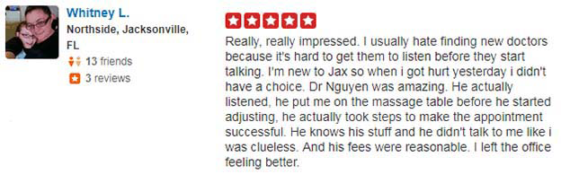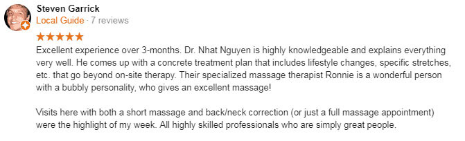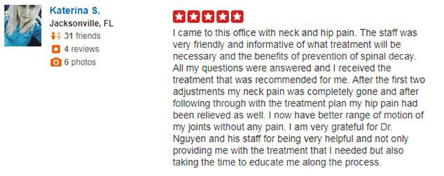 “My back feels so much better after the treatments I’ve received here than it has in years. Dr. Nguyen, Dr. Jess, and every single member of their staff is friendly, caring, takes the time to explain the answer to any questions you may have, and seem to genuinely care for their patients.”
